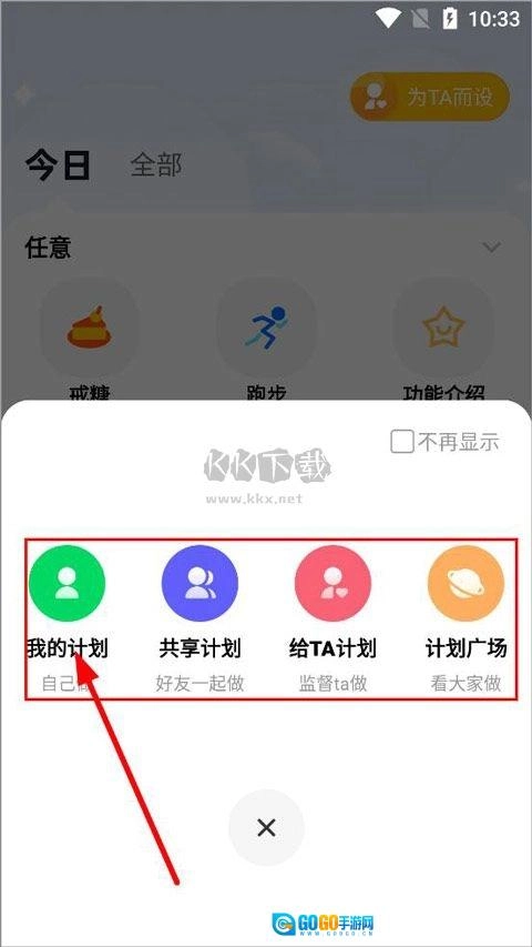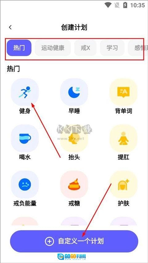 创建计划时,可依据热门类别(如健身、早睡、背单词、喝水等)、运动健康、戒xx、学习、感情建设等分类进行创建,也能点击下方的自定义计划选项。