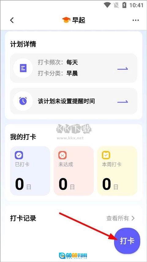 设置好打卡计划后,在计划页面点击对应的打卡项目进入详情页,然后点击页面右侧的打卡按钮即可完成打卡操作。