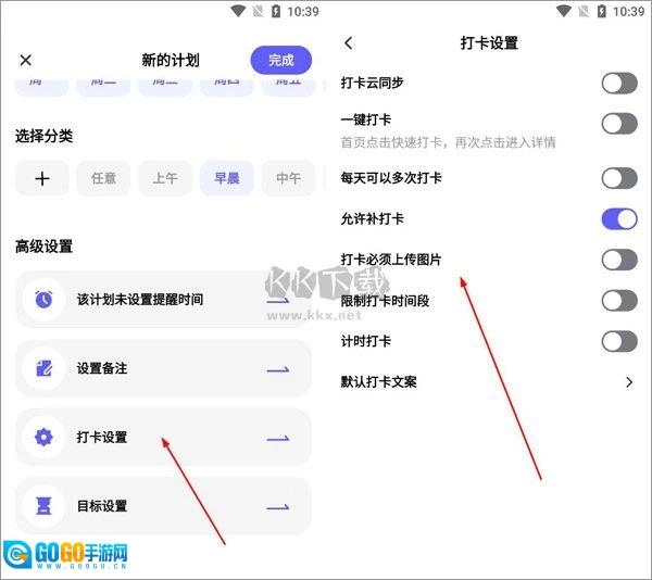 可以在高级设置界面中,对计划提醒时间、备注信息、打卡规则以及目标要求进行配置。其中打卡设置支持同步打卡或一键打卡功能,也能设定多次打卡的需求,并且允许上传打卡相关图片。完成所有设置后,就能在计划页面中查看这些配置内容了。