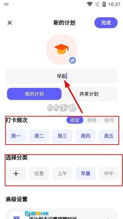 请输入计划标题,接着设置打卡频次(可选择固定、按周或按月模式),再从打卡时间分类里挑选(选项包括任意时间、上午、早晨、中午)。