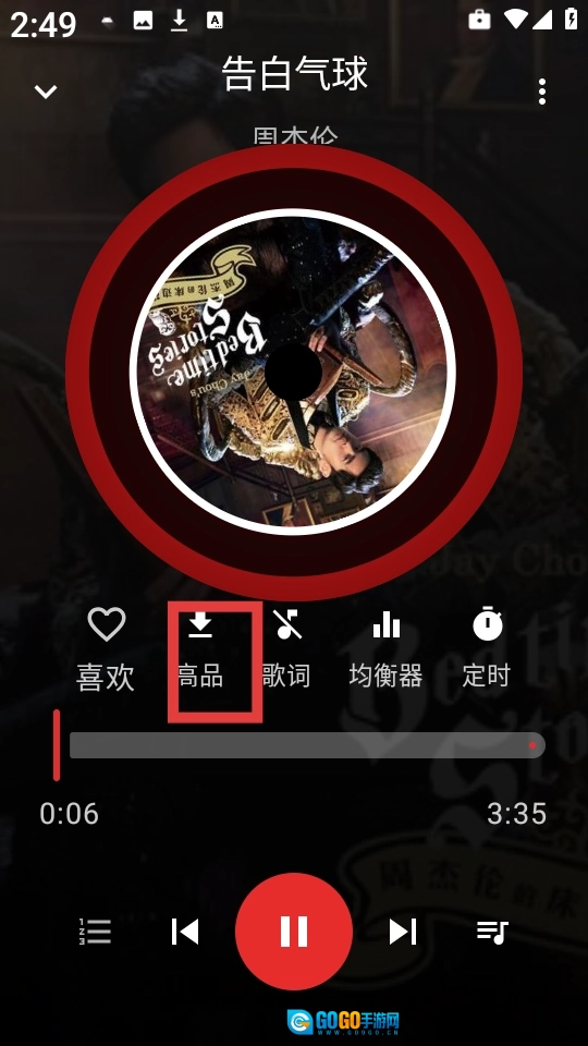 进入EMO音乐板块后,随机播放一首歌曲,找到对应的“”按钮。