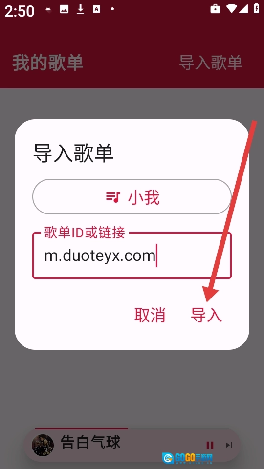 然后自定义输入歌单链接之后,点击“导入”即可。