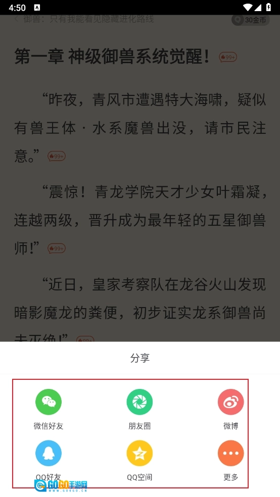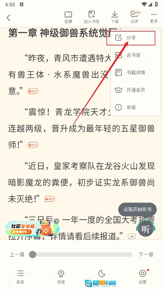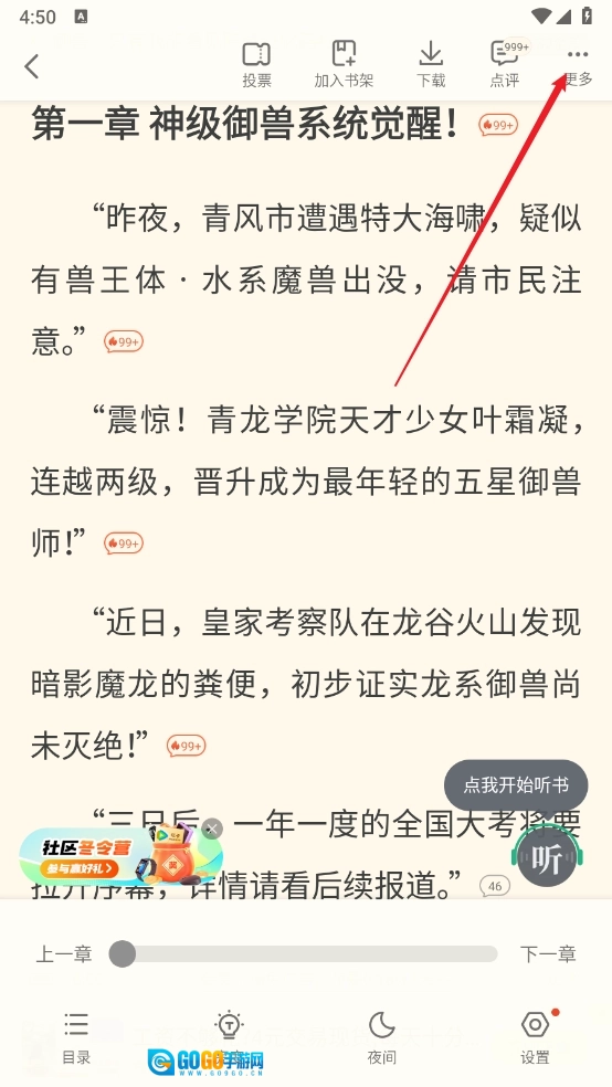 接下来在阅读界面轻点中间区域调出菜单,再点击“更多”选项。