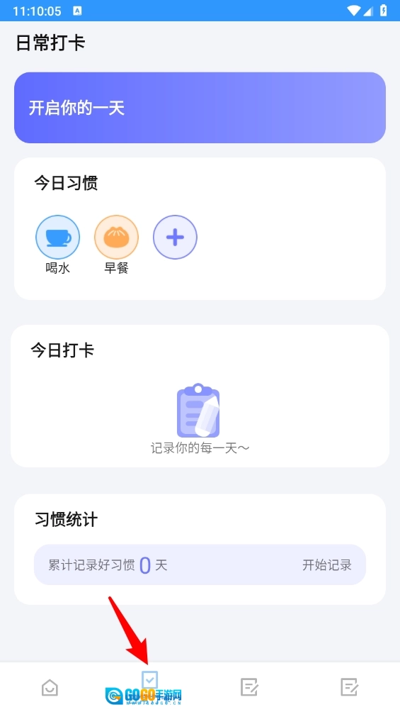 在“日常打卡”页面,你可以完成喝水、早餐、跑步等项目的打卡操作。