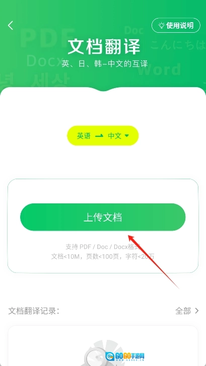 文档翻译的操作步骤如下:点击文档翻译按钮,接着选择并上传待翻译的文档,该功能支持PDF、Word等多种格式。