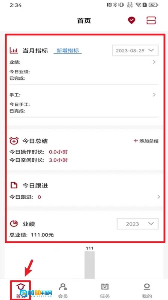 登录成功进入首页后,你可以在该页面查看今日总绩、服务时长以及个人业绩进度。