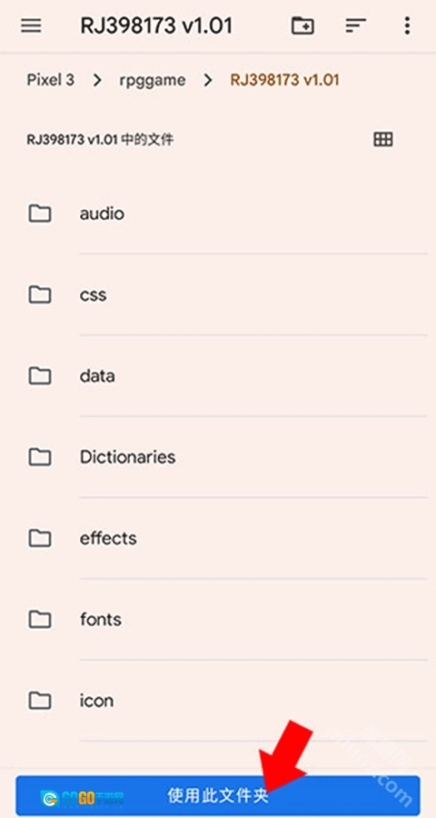 找到我们刚才解压好的游戏文件夹,然后点击下方的“使用本目录文件”按钮(要是游戏并非由RPG Maker MV制作,系统会弹出提示告知无法运行该游戏)