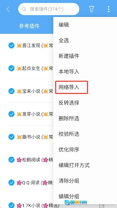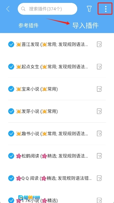 在插件页面里找到“导入插件”选项并选中,接着点击右上角的更多功能图标。
