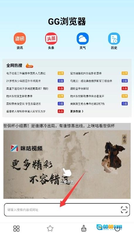 在主页底部的搜索栏中输入关键词或者网址,点击搜索按钮就能迅速找到想要的内容。