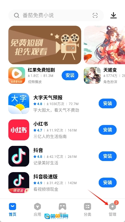 然后打开应用,在底部导航栏中选择“管理”选项。