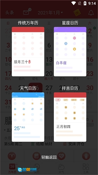 再点击一次,就能回到主界面;点击右侧的黄历,可查看中国传统黄历。