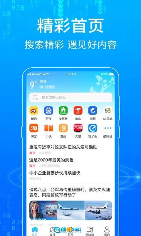 这款应用安装包体积超小,内存占用极低,运行起来极速又轻巧!不仅安全还能节省流量!它支持主流的各大搜索引擎,涵盖海量新闻头条、免费小说影视以及网址导航功能,能满足你90%的手机上网需求!