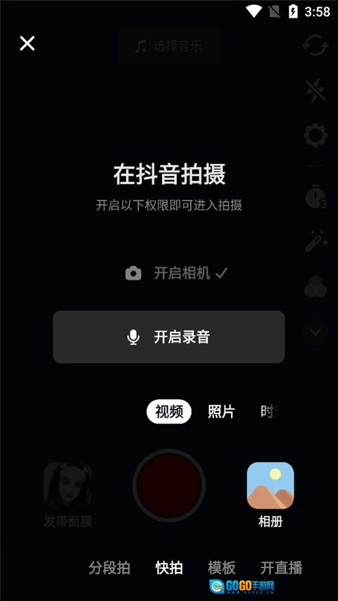 打开软件后,我们点击加号按钮准备拍摄视频,却发现手机相册功能无法使用,导致无法进行视频拍摄。