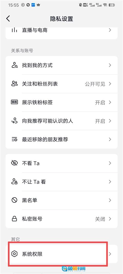 进入隐私设置后,一直向下滑动,滑到最底部时点击系统权限。