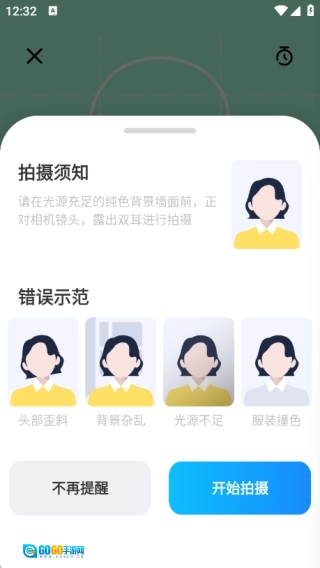 进入证件照拍摄页面后,用户可以查看拍摄须知,了解各类错误示范,从而更轻松地完成拍摄。