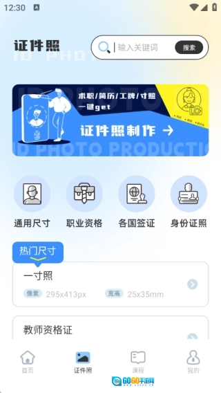在证件照页面里,设有通用尺寸、职业资格、各国签证以及身份证照等不同版块,同时也包含了各类热门尺寸。