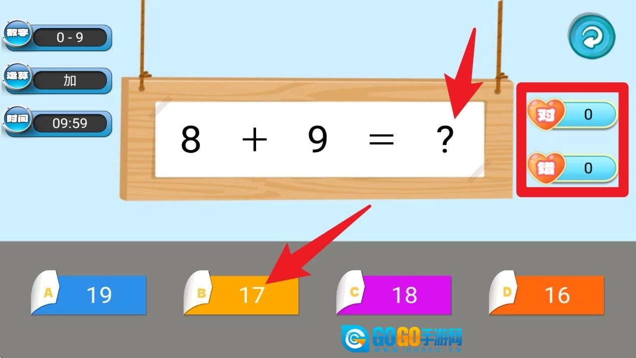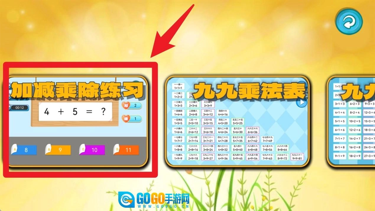 进入「加减乘除练习」模式后,系统会自动生成题目,玩家需要从给出的四个选项里挑选出正确的答案。