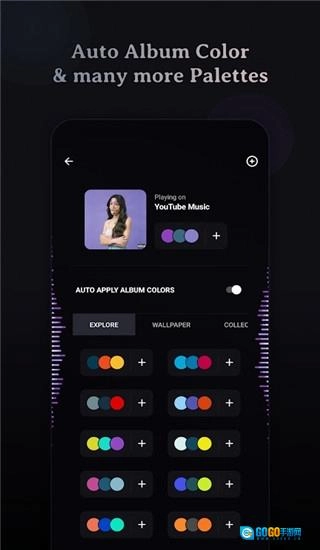 - 涵盖自动应用专辑封面色彩、自定义调色板以及从调色板套装里挑选颜色。