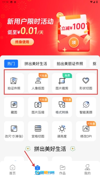 进入图片处理首页后,新用户可参与限时活动,使用宫格拼图、拍摄证件照、抠人换背景等功能,还能选择长图拼接、台词拼接等工具进行图片处理。