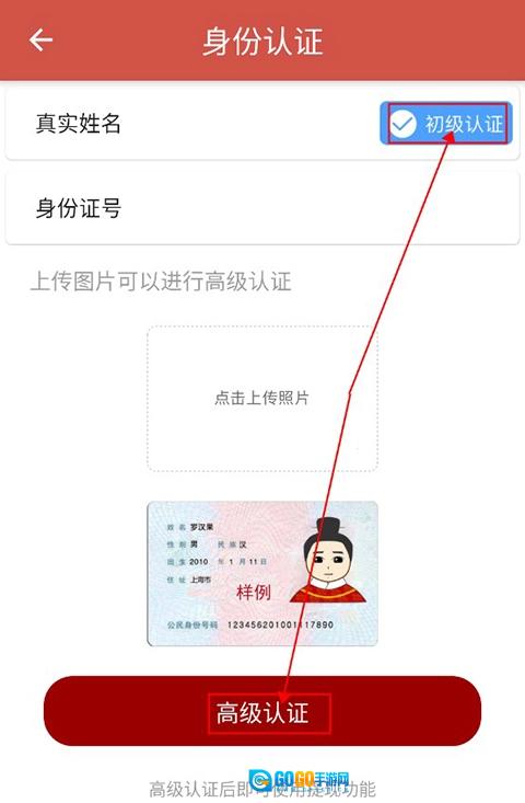 用户接下来需完成实名认证并上传身份证,这两项操作结束后,即可点击高级认证选项,完成高级身份认证流程。