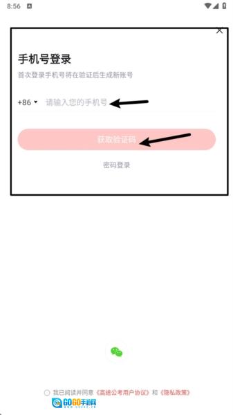 打开应用程序后,进入“手机号登录”界面,输入手机号码并点击“获取验证码”按钮,以此完成注册或登录操作。