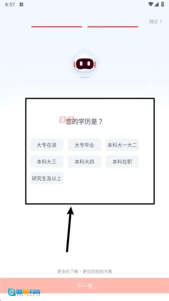 接着选择当前所处的学历阶段,像“本科在读”“研究生及以上”这类选项,以此来生成符合个人情况的学习方案。
