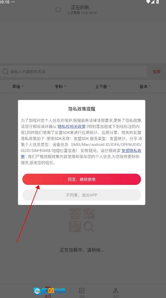 启动答案圈,先点击同意用户使用协议。