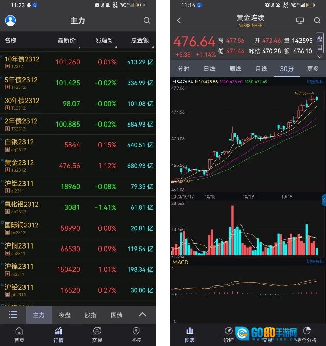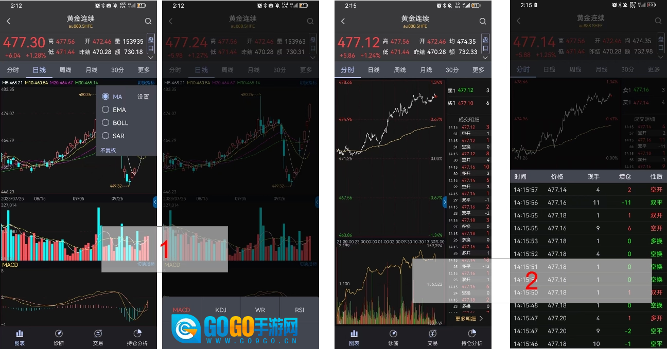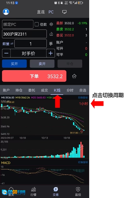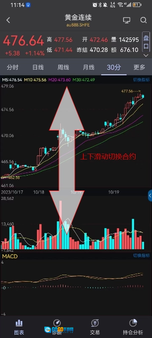 在K线页面上下滑动可切换合约,合约的切换顺序遵循当前合约所处行情列表的顺序。