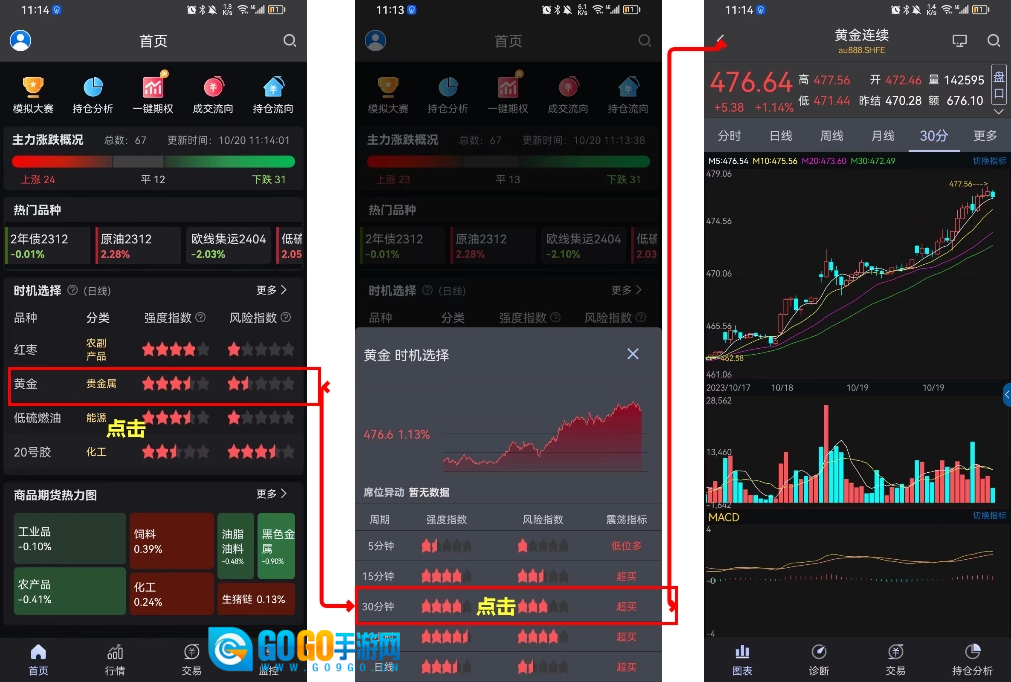 可以从趋势指数、强度指数、多空力量对比、持仓流向、资金流向这些功能里,点击某一具体合约或品种来打开