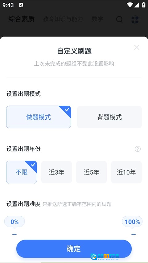 3、以及设置出题难度,每组题的数量,确认无误后点击确定开始刷题。
