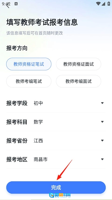 2、您可以在此页面更改报考方向、学段、科目、省份以及地区等,点击完成。