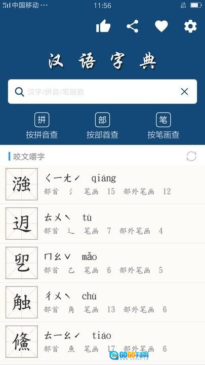 支持汉字、拼音、部首、五笔搜寻方式。
