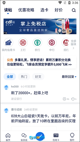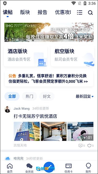 里程积累兑换技巧、会员升级保级、积分兑换换算、信用卡刷卡技巧方法、常客达人分享、酒店航空促销折扣信息等等旅行指南,随时随地查询,一键发帖分享。