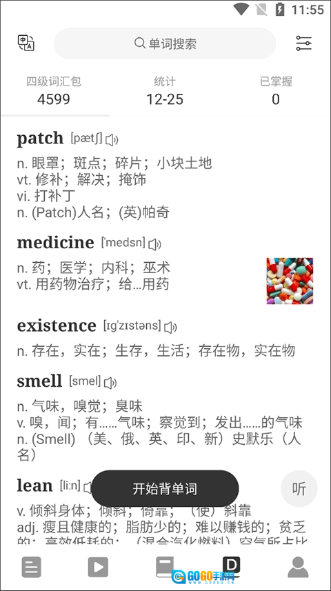 - 背词模式包含看英选中、看中选英、听音选词、单词拼写等多种形式,能显著降低英文阅读的难度;