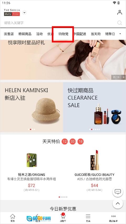 进入新罗免税店后,在顶部菜单栏里就能找到【购物党】选项(即下图红色方框标注的区域)