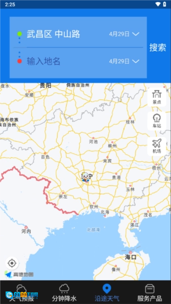 【沿途天气】采用地图形式呈现,为用户展示其出行路线上的天气状况。