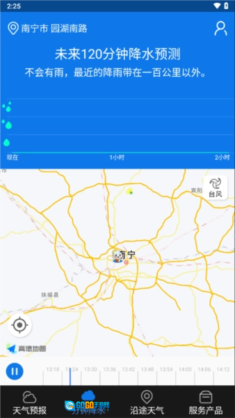 【分钟降水】功能呈现未来两小时内的逐分钟降水信息,采用地图叠加的形式展示雷达实况图等相关数据。
