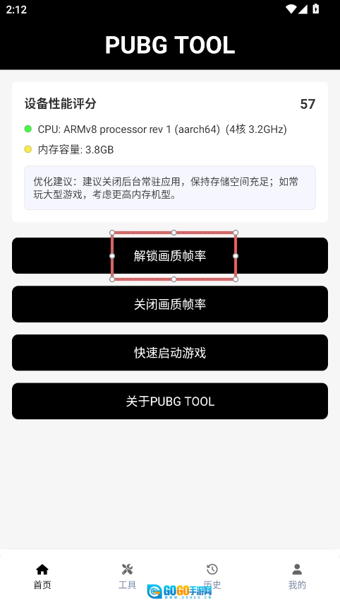 打开pubgtoll画质助手,点击【解锁画质帧率】选项。