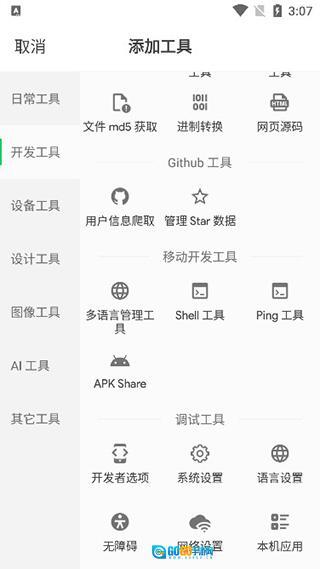 当前应用内的工具被划分为生活工具、开发工具、设备工具、AI工具、设计工具、图像工具和其它工具这七大类别。