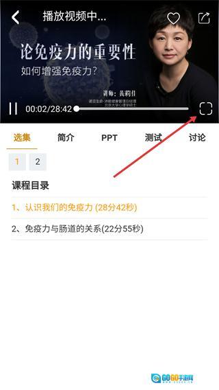 在视频播放页面,点击全屏按钮就能切换到全屏模式,这样观看课程视频会更清晰。