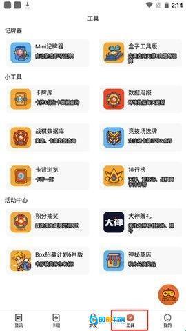 点击“工具”选项,这里为用户配备了mini记牌器、盒子工具版、卡牌库、竞技场选牌等多种实用工具。
