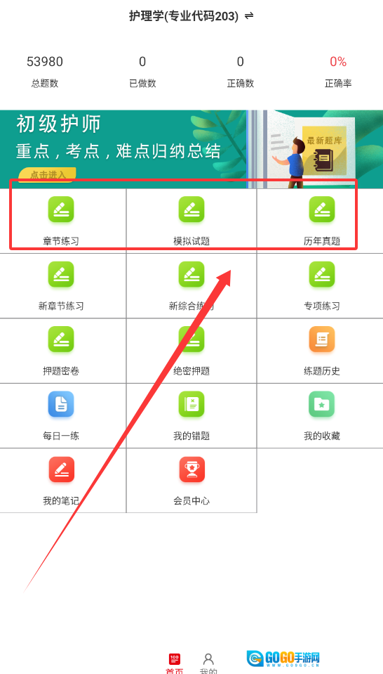 1、可助你快速掌握整体学习进度,下方设有章节练习、模拟试题、历年真题等核心功能的绿色入口按钮。