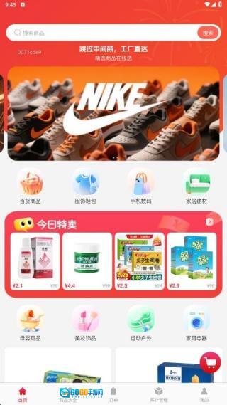 进入安装后的界面,首页设有百货商品、服饰鞋包等产品分类板块,同时还展示着特卖好物的推荐内容。