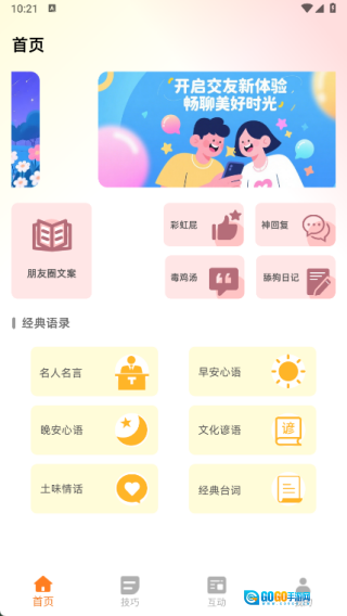首页涵盖了朋友圈文案、彩虹屁、神回复、毒鸡汤、舔狗日记,以及经典语录等内容。
