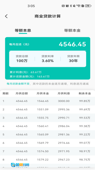 商业贷款计算功能支持等额本息还款与等额本金还款两种方式的计算。