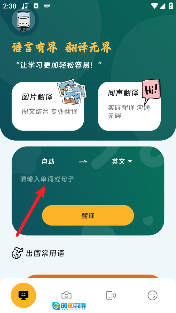 2、进入主页,按照图示操作,在输入框中填入单词或句子后,点击“翻译”按钮。