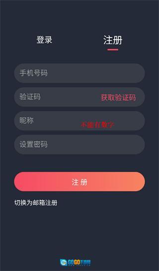 2、有账号密码直接登录即可,首次使用切换为“注册”,输入手机号、昵称以及密码;