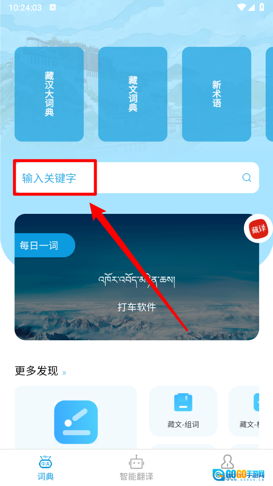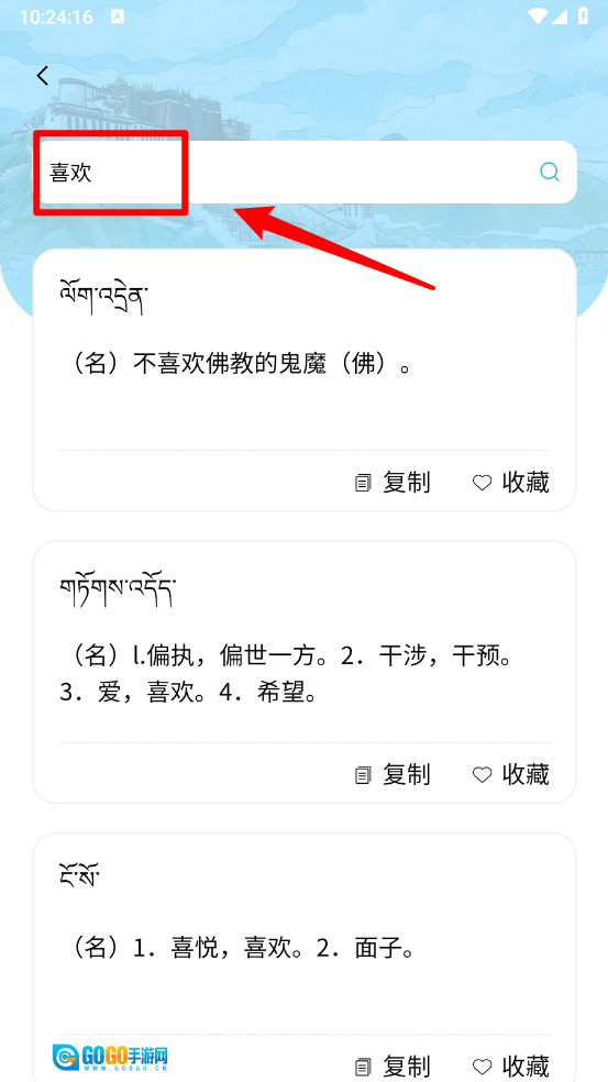 2、如图所示,输入关键字即可查询藏文,同时支持一键翻译与收藏功能。