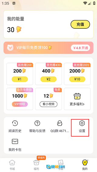 1、打开手机里的点点穿书软件,进入“书城”界面,这里有海量正版优质小说资源,接着点击下方导航栏最右侧的“我的”选项。