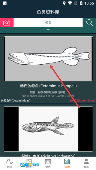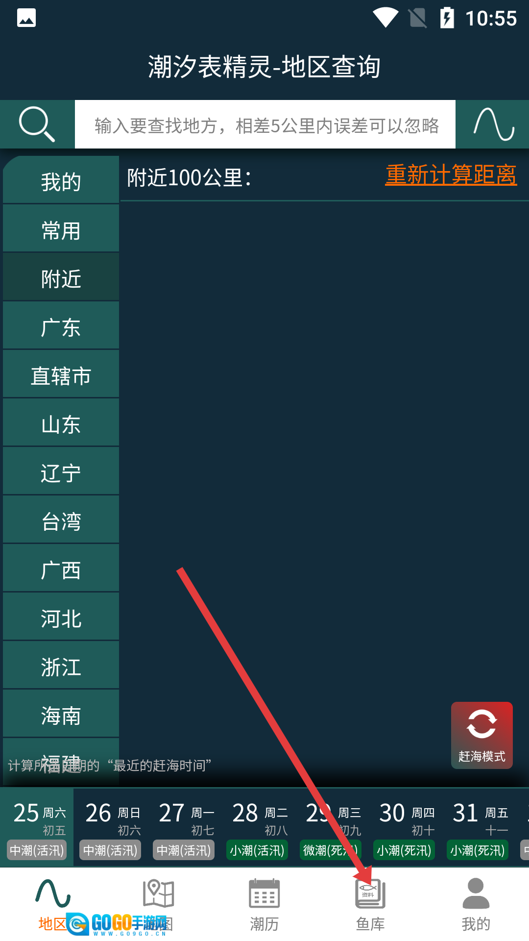 在潮汐表精灵地区查询界面,点击底部的【鱼库】选项,即可进入鱼类资料库。